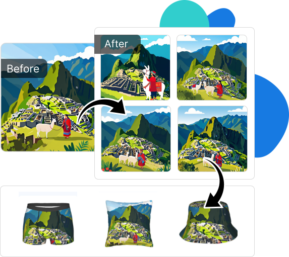 Upload any image and watch our artificial intelligence create dozens of similar but legally distinct designs. Perfect for print on demand automation and scaling your product catalog without copyright concerns.