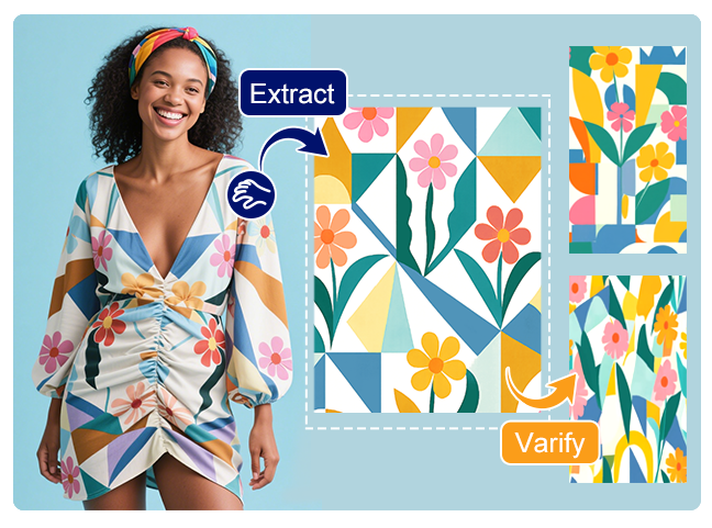 Our advanced computer vision technology can isolate patterns, textures, and designs from clothing, home decor, and any printed material - even with wrinkles, shadows, or obstructions. Achieve 99% extraction accuracy for immediate print on demand application.